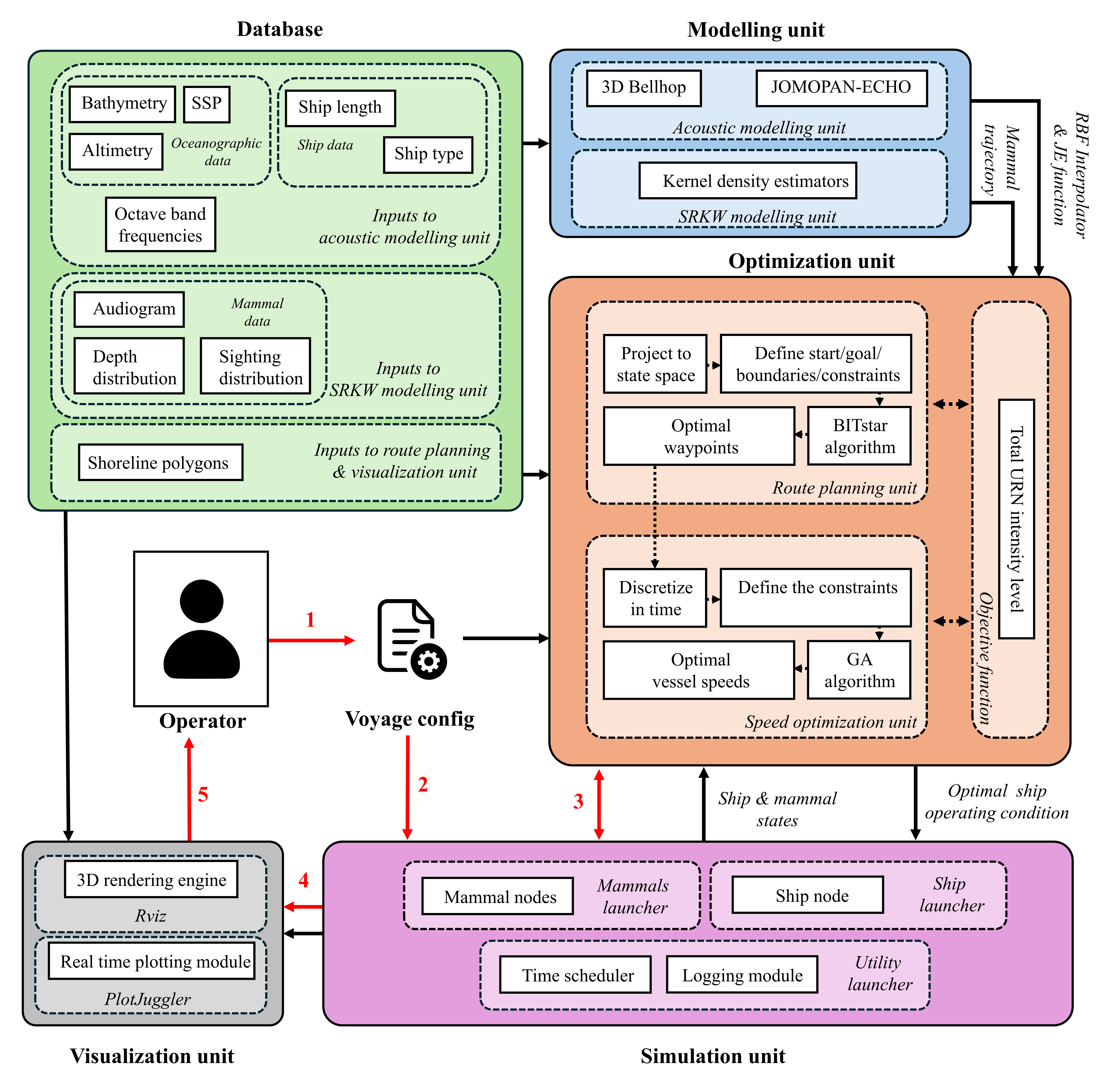 Comprehensive flowchart illustrating the voyage planning software framework with integrated user interface components, performance modeling modules, optimization algorithms, and post-voyage analysis tools for complete voyage management.