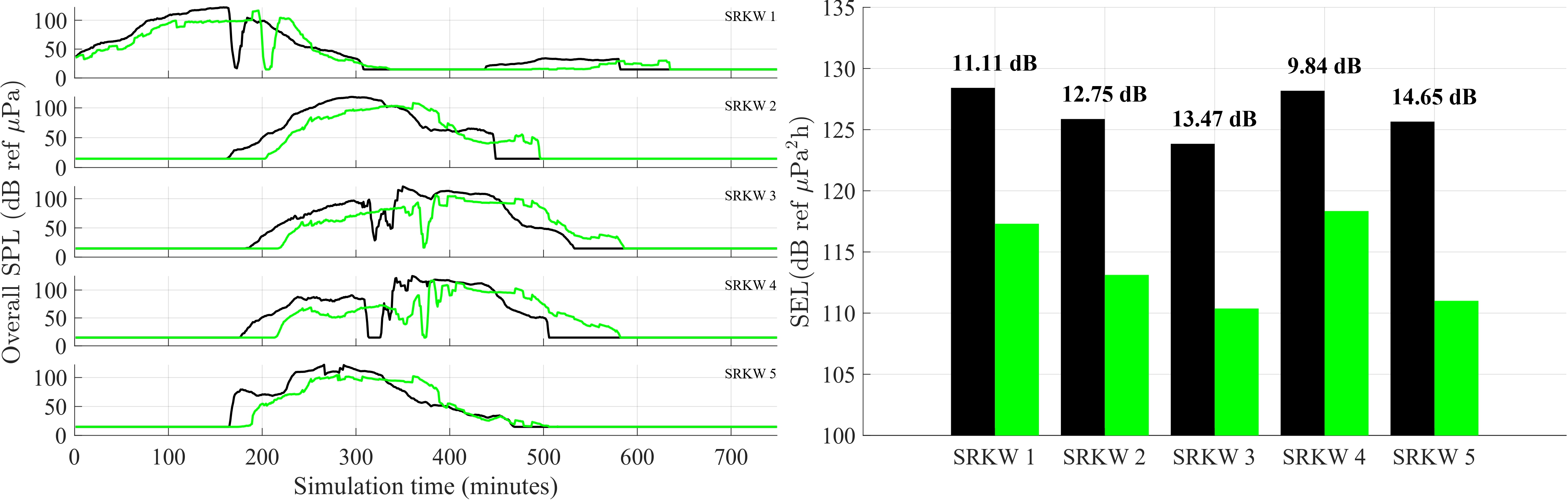 Comparative analysis of noise exposure levels between AIS-based conventional maritime operations and optimized voyage planning scenarios, demonstrating quantitative acoustic impact reduction through intelligent route optimization strategies.